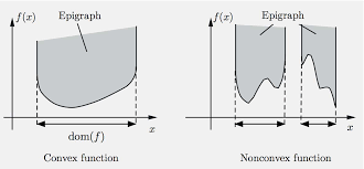 The epigraph of a function \(f\) is the set \[ \text{epi}f = \{(\mathbf{x}, t): \mathbf{x}\in\text{dom}f,~ f(\mathbf{x}) \le t \}. \]
